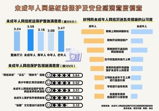《未成年人网络权益保护及安全感满意度调查报告》显示,受访者对未成年人网络权益保护整体的满意度为3.24分(满分5分),较2021年(3.17分)有所提升,受访未成年人的满意度比成年人高0.43分。