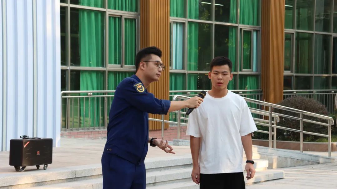 普宁市南环大道消防救援站政治指导员陈楷煜同志现场在演示如何正确使用灭火器,让在场师生切实地了解、掌握灭火器的正确操作技能,并特地提醒大家一定要注意风向及火势,实在不能扑灭要及时拨打消防救援电话119进行求助。