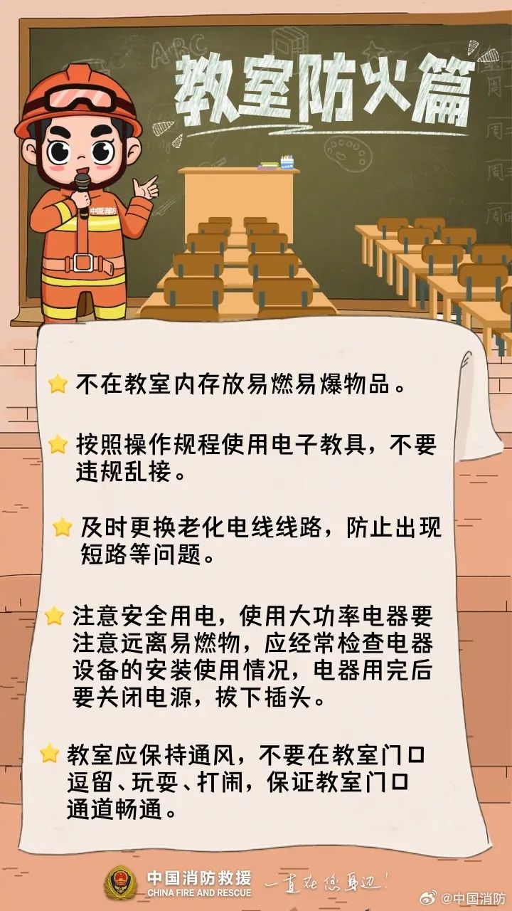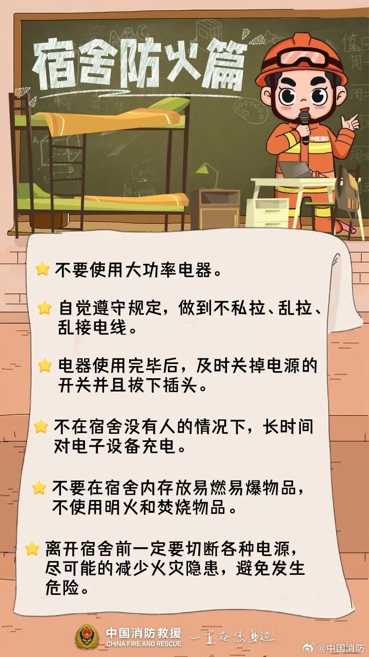 学校作为人员密集场所,消防安全尤为重要。日前,中国消防微博发布了关于校园的消防安全注意事项,一起来复习——