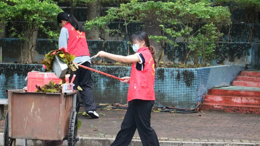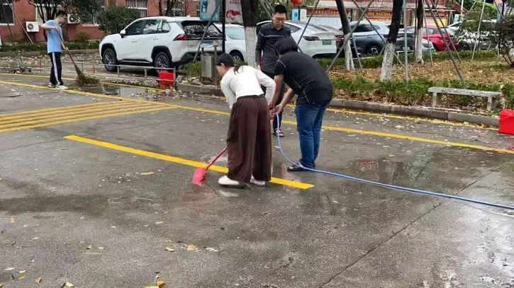 师生党员们分组行动,手持清洁工具深入潮韵广场、文化长廊、教学楼、校道、运动场、食堂、师生宿舍楼等区域,清扫路面落叶、擦拭公共设施、清理卫生死角。劳动过程中,党员师生们分工协作,干劲十足,充分展现了不怕脏、不怕累的奉献精神。经过集中清理,校园环境焕然一新,师生们的劳动成果获得来往师生的频频点赞。